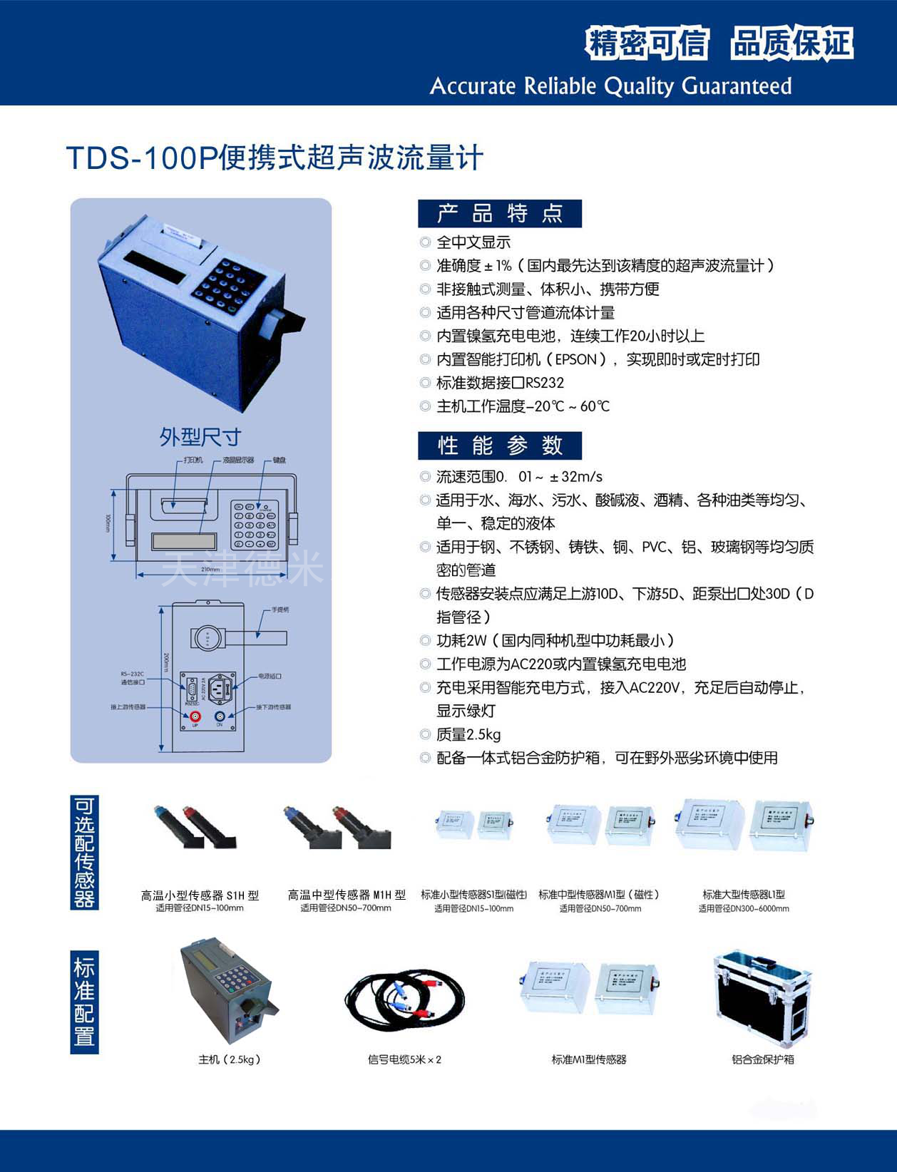天津德米尔精品系列TDS-100H手持式超声波流量计,热电暖通工程供暖供热流量计,适用于各种工业现场中液体流量的在线标定和巡检测量。具有测量精度高、一致性好、电池供电、操作简单、携带方便等特点,是目前国内体积*小、质量*轻,真正意义上的便携式超声波流量计。广泛适用于各种尺寸管道流量计量,流速测量范围为0.01~±32m/s,测量介质为水、海水、污水、酒精等单一稳定的液体,测量材质为钢、不锈钢、铸铁、PVC、玻璃钢等均匀质密的管道。