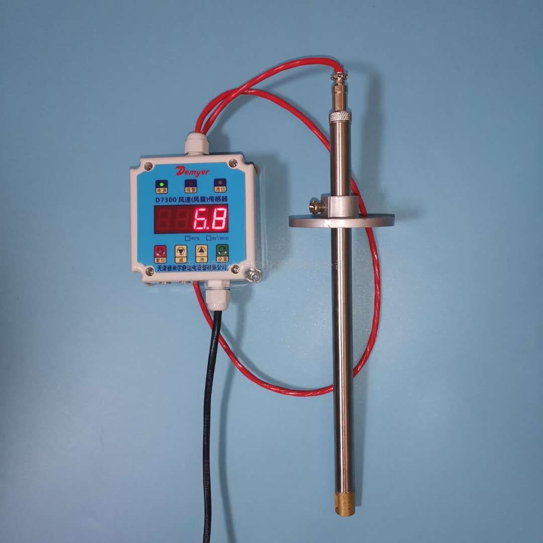 天津德米尔自动化设备有限公司主打产品---D7300在线流速仪0-20m/s 4-20ma流速变送器/传感器 数字流速表, 主要测量空气空调通风机组风管风速或风量的在线测量仪器,自由选用一体式和分体式安装两种外形,法兰固定,插入式法兰安装,插入深度可自由调节,操作简单方便快捷,普通型风速和风量两种测量模式供客户设定切换。产品为不锈钢探杆,普通型长度为100mm,200mm、250mm,高温型长度为300mm、400mm,500mm,其他长度均可定制。多种信号输出,包括RS485、0-10V、4-20mA等,可只读风速/流量数值,